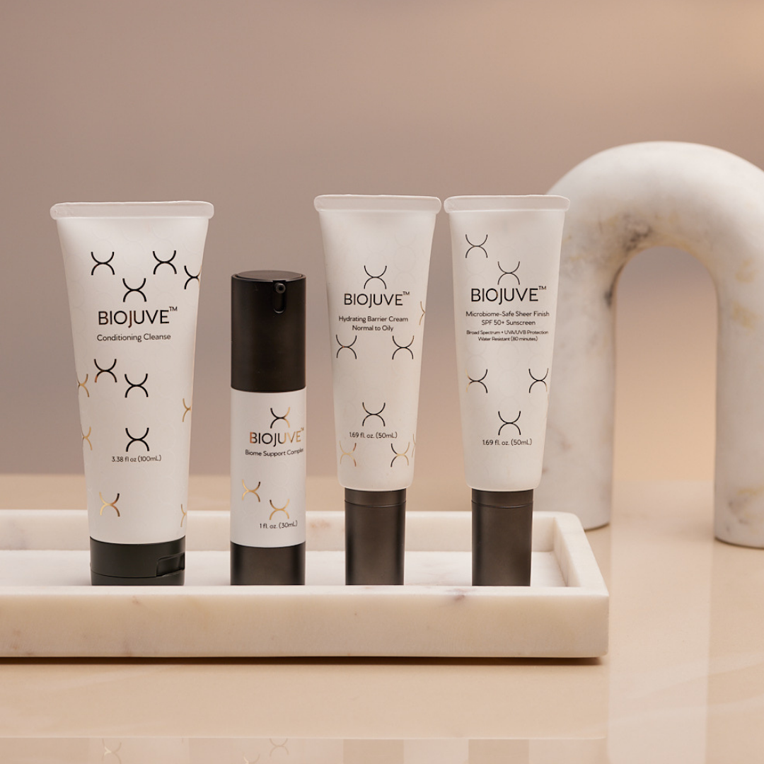 Contains all 4 Steps of the AM BIOJUVE System: STEP 1: BIOJUVE Conditioning Cleanse (Prebiotic), STEP 2: BIOJUVE Biome Support Complex, STEP 3: BIOJUVE Hydrating Barrier Cream, STEP 4: BIOJUVE Sheer Finish SPF 50+ Sunscreen