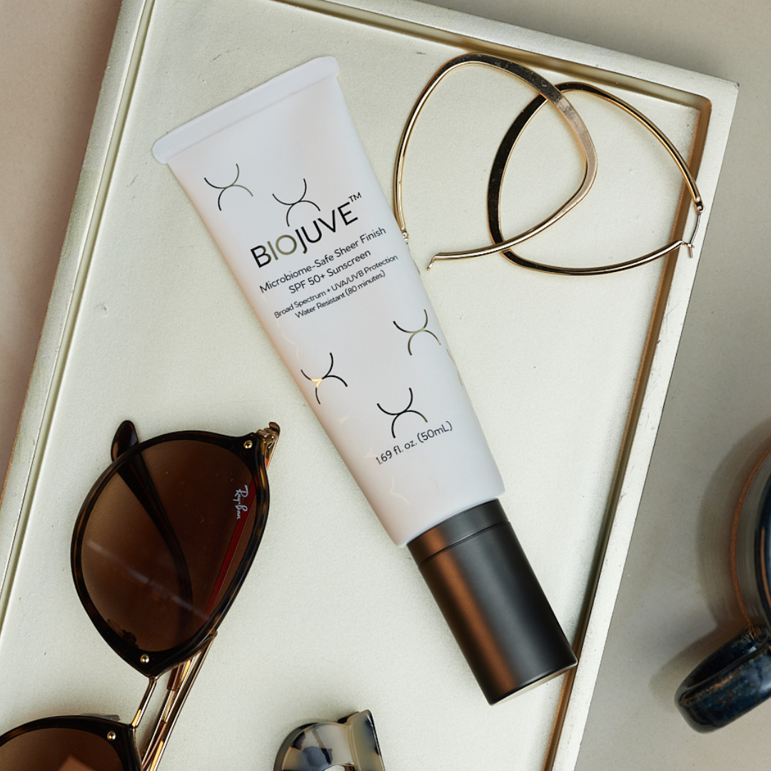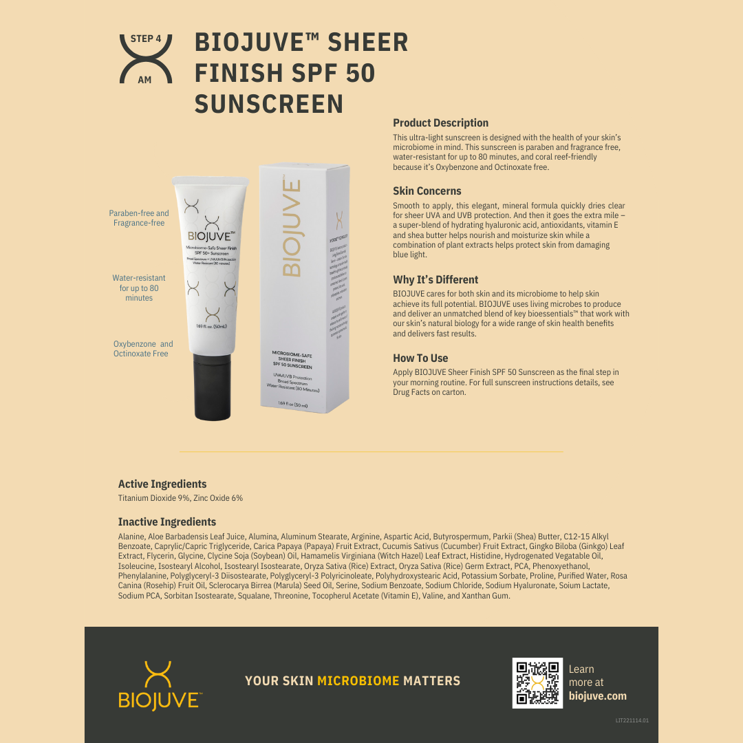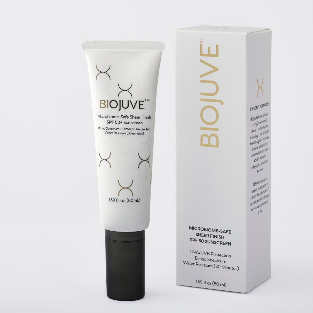 Apply BIOJUVE Sheer Finish SPF 50 Sunscreen as the final step in your morning routine. For full sunscreen instructions details, see Drug Facts on carton.